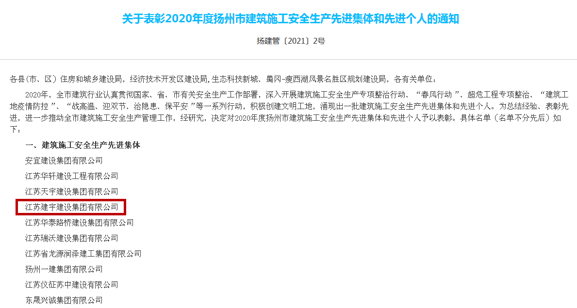 近日,集團(tuán)又一次被揚(yáng)州市人民政府評(píng)為2020年度揚(yáng)州市建筑業(yè)先進(jìn)企業(yè),這是集團(tuán)第十次獲此殊榮。同時(shí)集團(tuán)第五次榮獲2020年度揚(yáng)州市建筑施工安全生產(chǎn)先進(jìn)集體,孫曉建同志榮獲優(yōu)秀班組長。