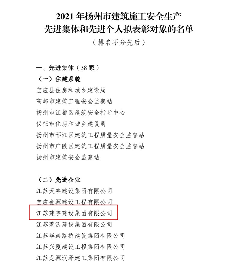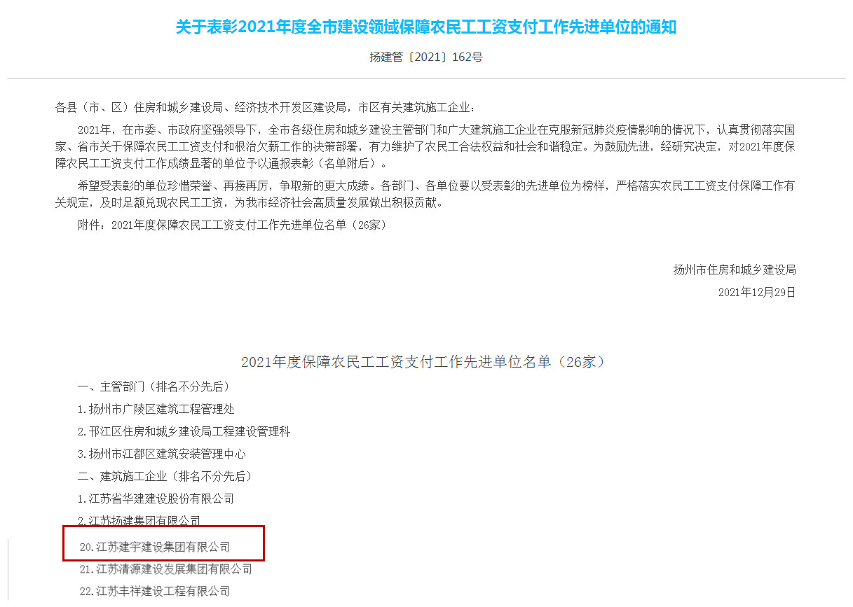 近日,集團被揚州市人民政府評為2021年度揚州市建筑業(yè)先進企業(yè),這是集團第十一次獲此殊榮。同時集團被揚州市住房和城鄉(xiāng)建設(shè)局評為2021年度揚州市建筑施工安全生產(chǎn)先進集體、2021年度揚州市揚塵管理先進單位、2021年度揚州市建設(shè)領(lǐng)域保障農(nóng)民工工資支付工作先進單位。此前,集團還被江蘇省精神文明建設(shè)指導(dǎo)委員會授予“2019-2021年度江蘇省文明單位”稱號。