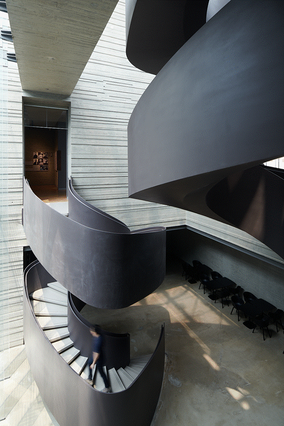 集團成立技術攻關小組,克服施工困難,為達到弧形、凹凸,連續無通縫等各類木紋清水砼表面效果,室內以10cm的統一模數適當弱化肌理,避免喧賓奪主;室外則運用了4cm、6cm、10cm三種模數,在一層為通長的肌理,二層出現長短變化,給人帶來水波蕩漾的意象遐思。
