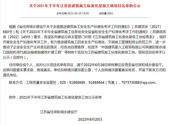 “江蘇省建筑施工標準化星級工地”是由江蘇省住房和城鄉建設廳每年組織評選,旨在表揚全省在安全生產標準化、文明施工管理和揚塵防控工作表現突出的單位,是江蘇省在安全文明施工方面的最高獎項。